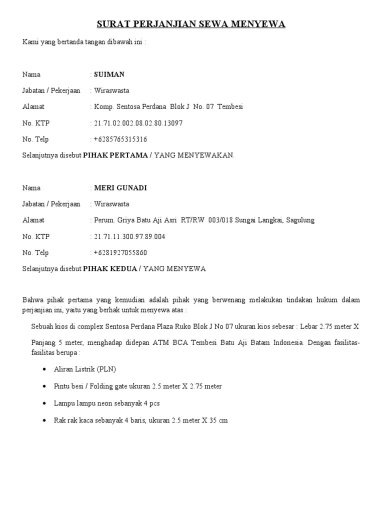 Poin pertama adalah menyebutkan identitas diri kedua belah pihak yang melakukan transaksi sewa menyewa ruko/kios contoh surat sewa menyewa ruko. Untuk mengelola/memberdayakan/menyewakan kepada pihak lain .
